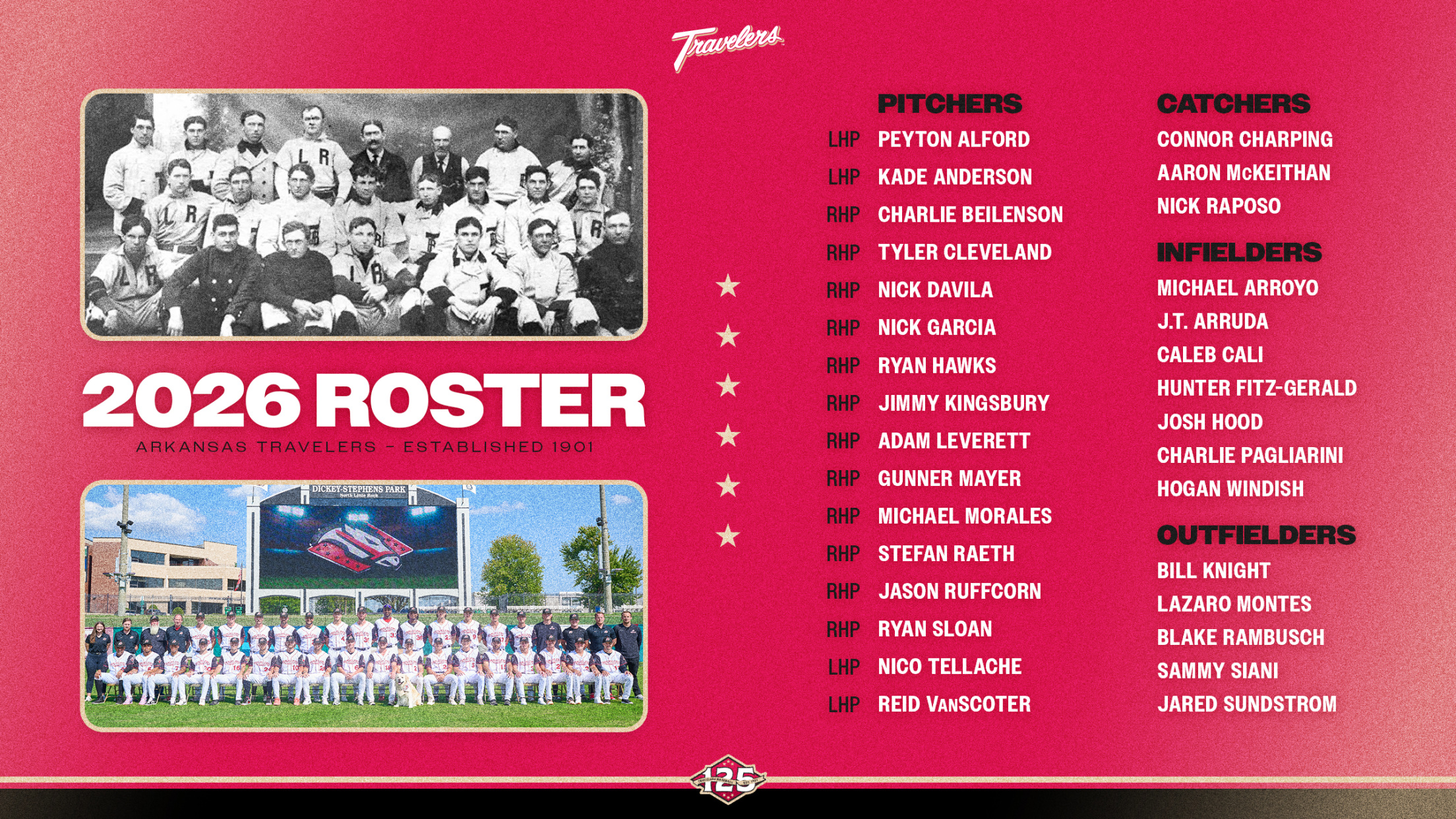 The Arkansas Travelers enter a milestone season in 2026, denoting the 125th anniversary of the club’s first season in 1901. A special logo, uniforms, and promotions will be used throughout the year to mark the celebration.
