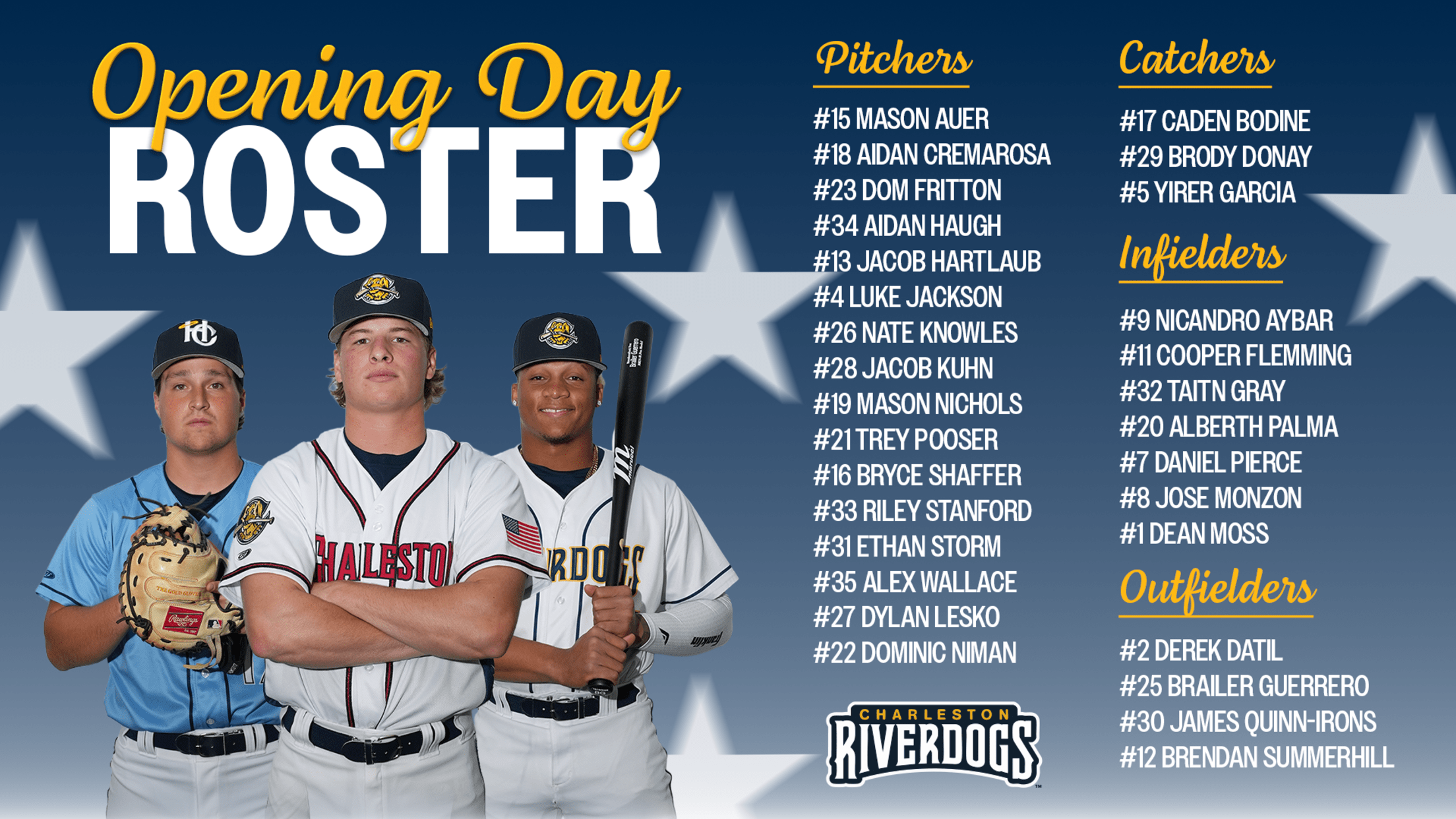 Charleston, S.C. – In conjunction with the Tampa Bay Rays, the Charleston RiverDogs have announced their 2026 Opening Day roster ahead of Thursday’s season opener against the Myrtle Beach Pelicans.