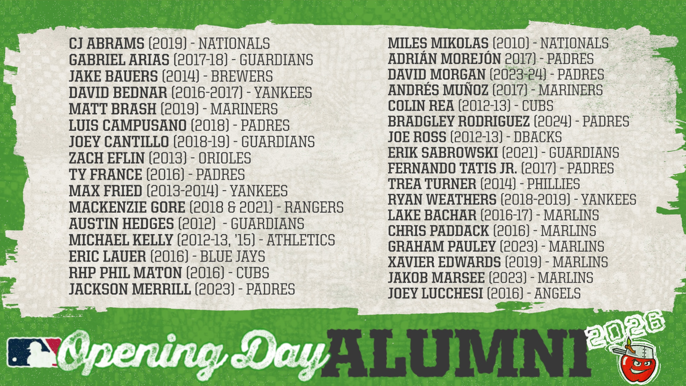 FORT WAYNE, Ind. – As the 2026 Major League Baseball season commences, a total of 33 former TinCaps players appeared on MLB Opening Day rosters.