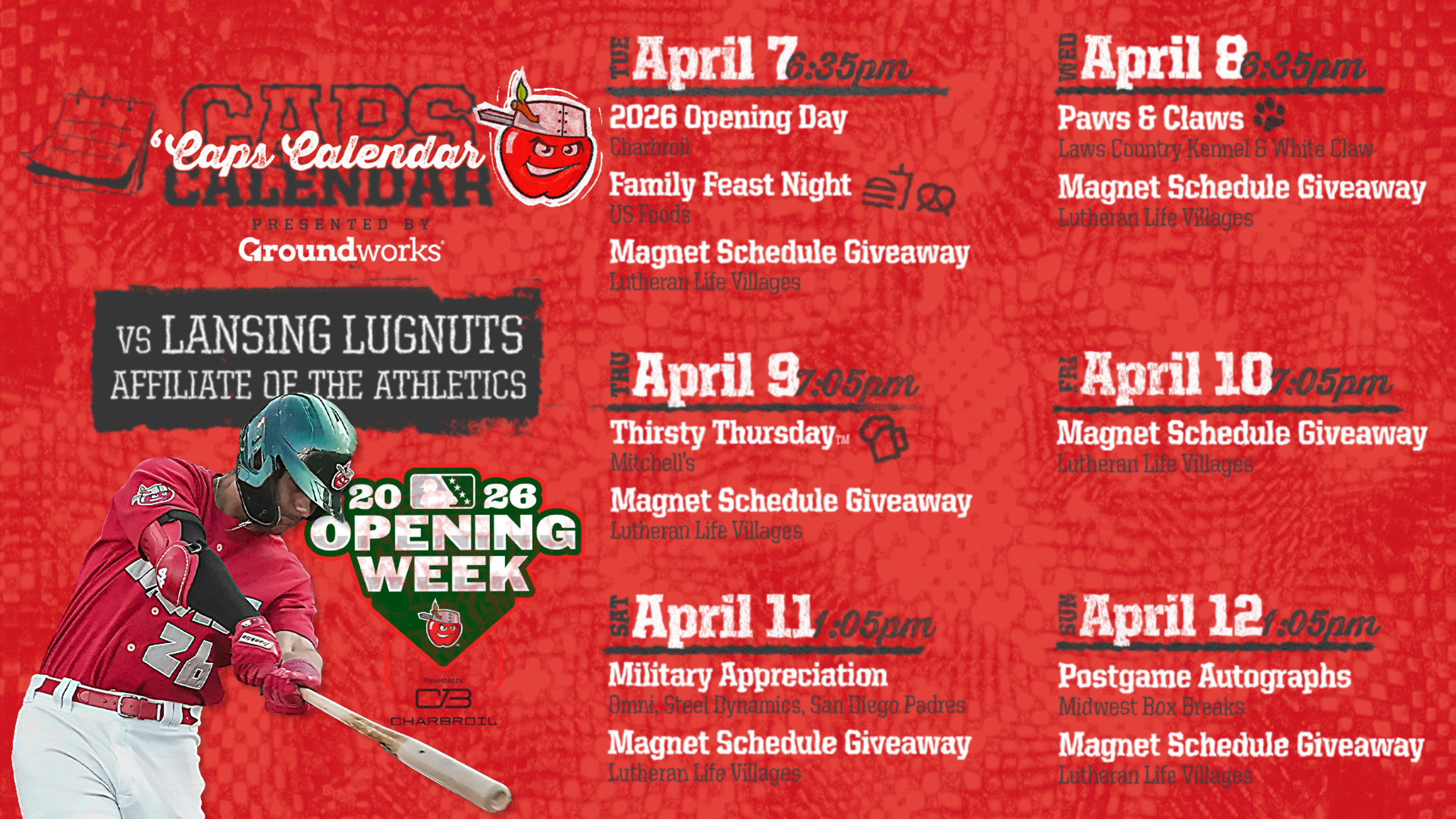 FORT WAYNE, Ind. – On Tuesday, Minor League Baseball released the Fort Wayne TinCaps’ 2026 regular season schedule. The ‘Caps will begin on the road for a three-game series before Opening Day at Parkview Field on Tuesday, April 7, against the Lansing Lugnuts (Athletics affiliate).
