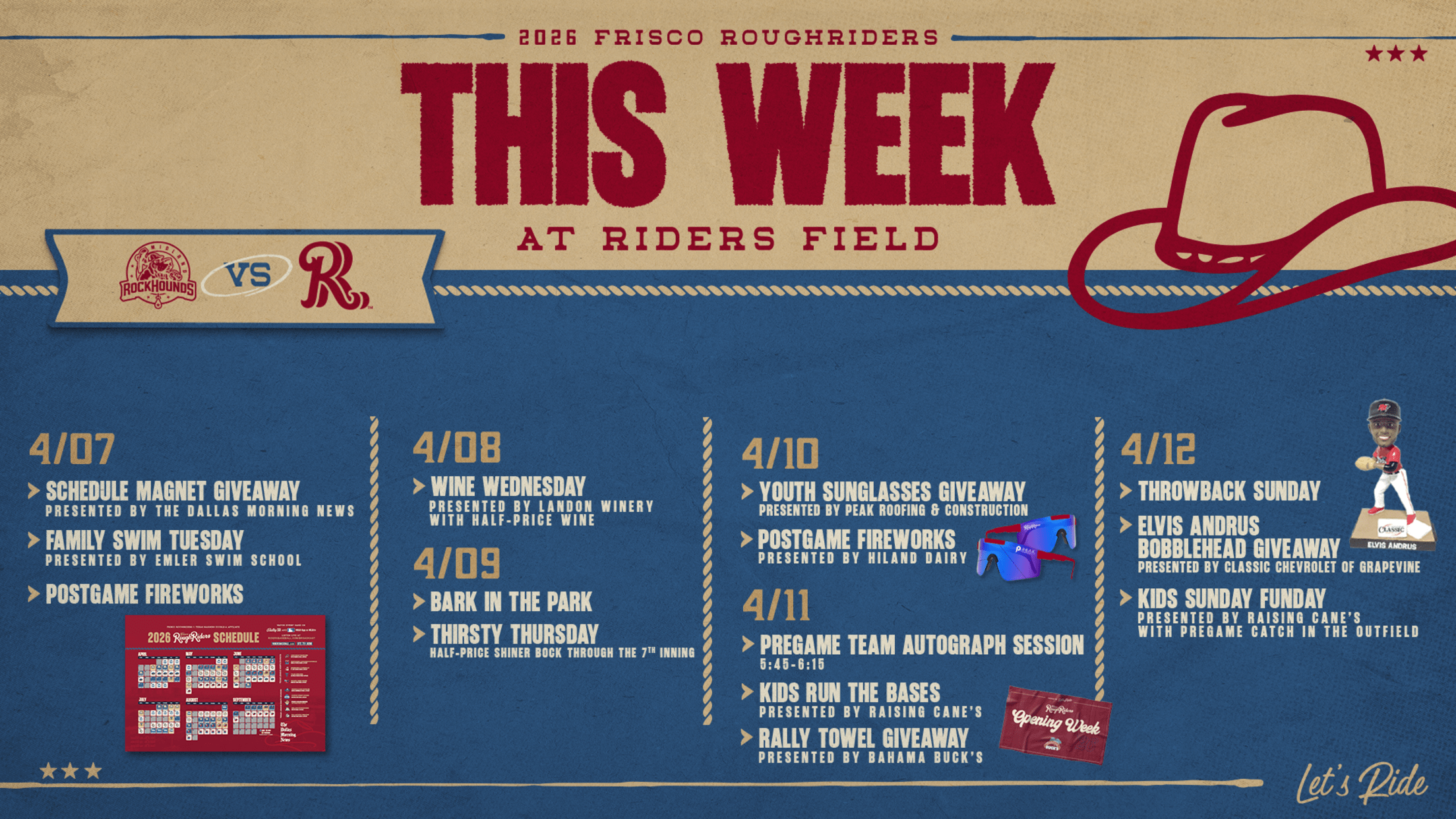 FRISCO, Texas (April 1, 2026) – After a long offseason, baseball returns to Riders Field April 7th through 12th for Opening Week. The six-game set features the RoughRiders and the Midland RockHounds, the Double-A affiliate of the Athletics. Special ticket offers are available for all Opening Week games by clicking here.