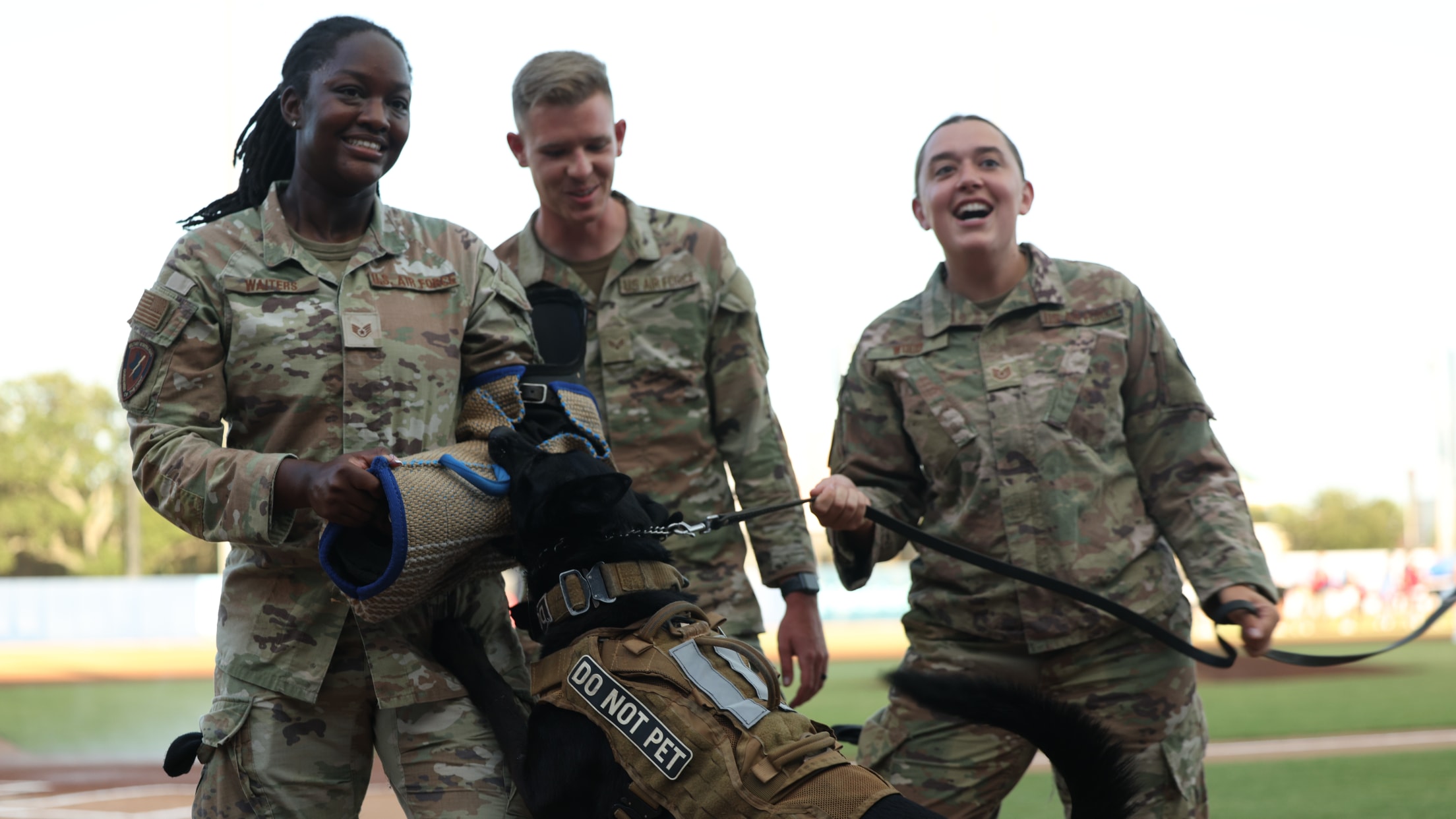 There is probably no place better to see working dogs and military celebrations than a Minor League Baseball game. Earlier this month at Keesler Federal Park in Biloxi, Mississippi, fans were treated to both.