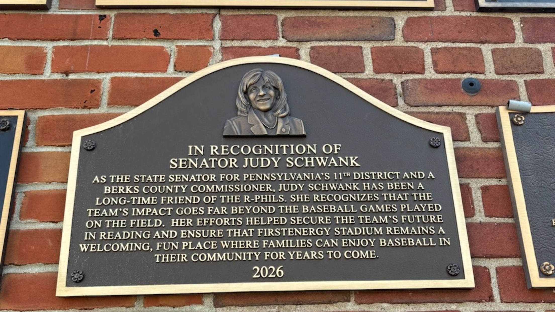 Reading, PA — March 31, 2026 — State Sen. Judy Schwank has been inducted into the Reading Fightin Phils Wall of Honor in recognition of her many years of service to Baseballtown and the broader Berks County community.